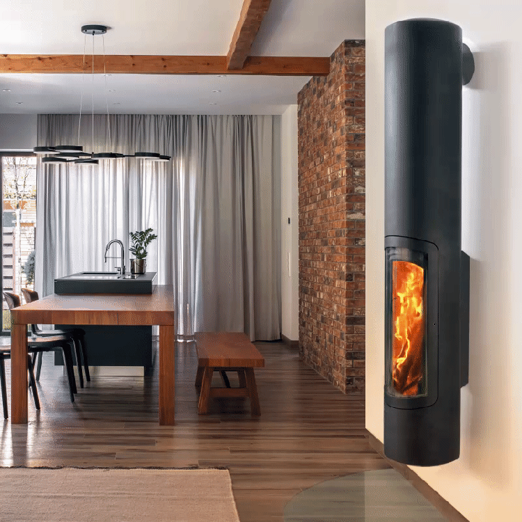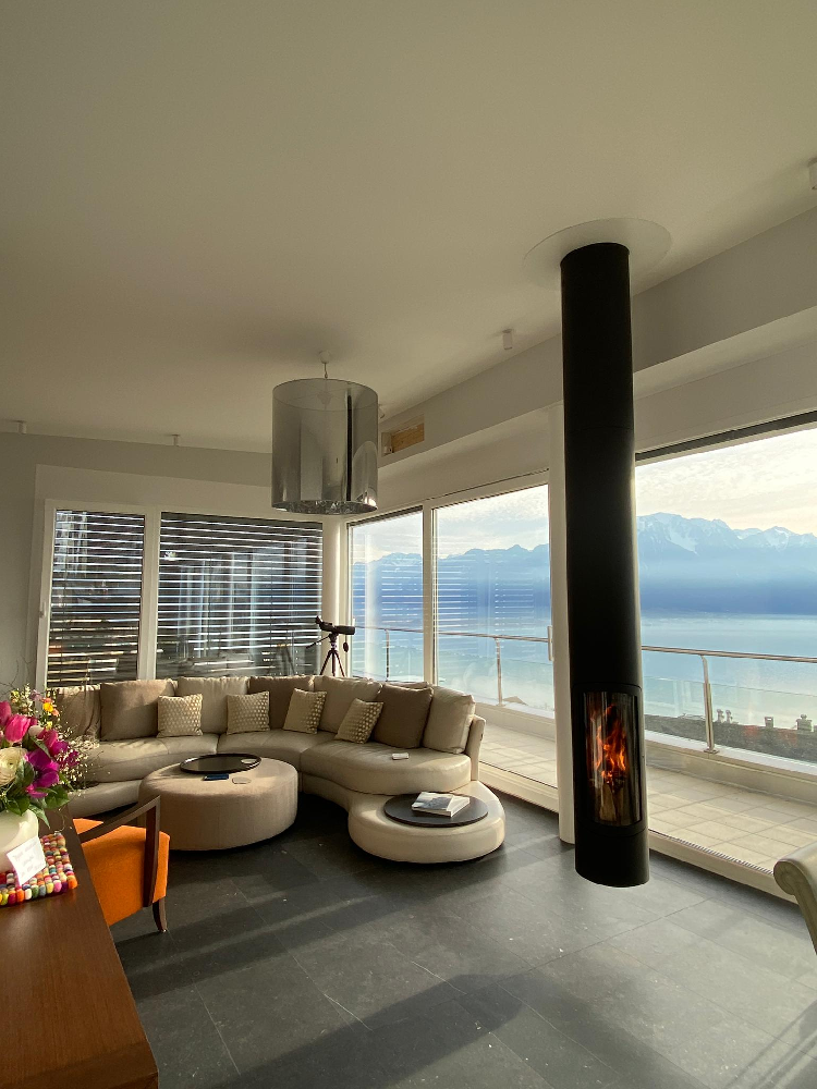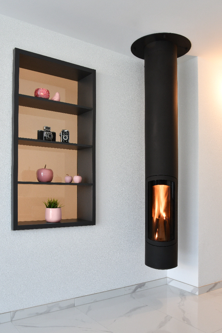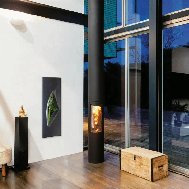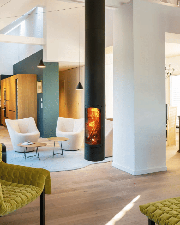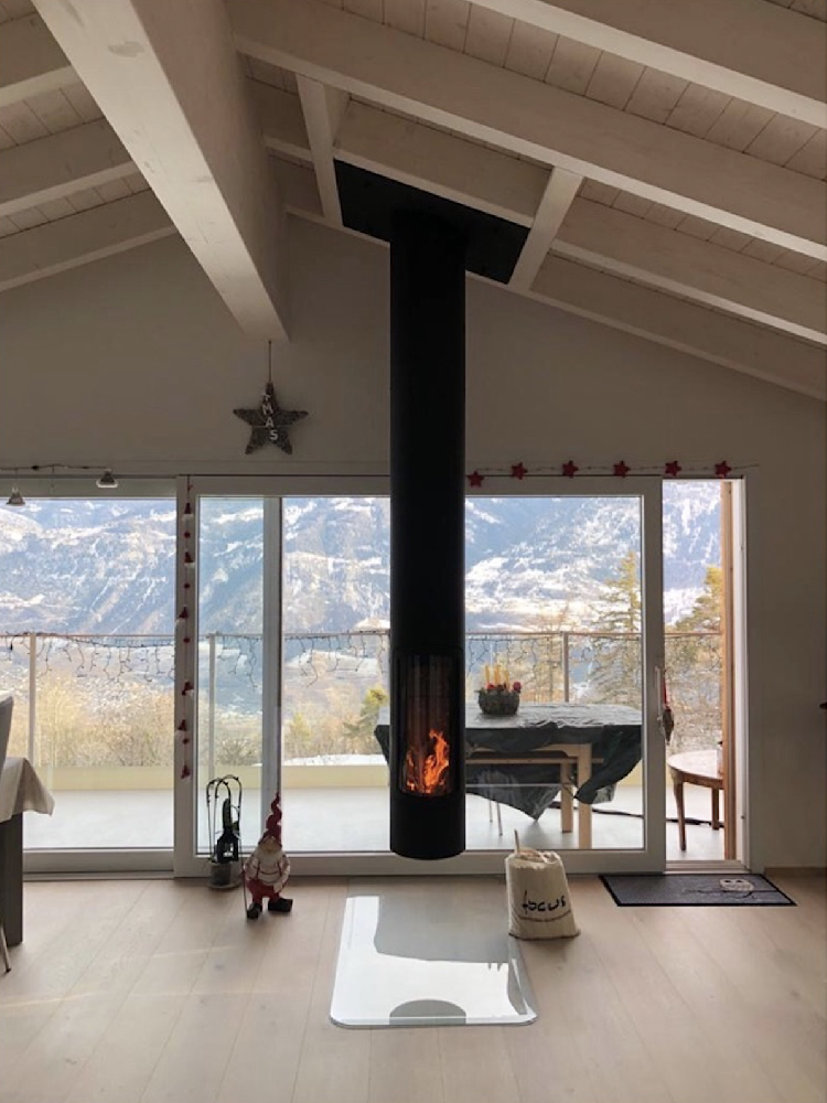 Slimfocus, der hängende, feste oder schwenkbare, zentrale oder an der Wand montierte geschlossene Kaminofen Schlank, schnittig und elegant, definiert sich der Slimfocus-Kamin als das Periskop des Feuers. Dieser preisgekrönte Kamin mit zeitgenössischem Design eignet sich besonders gut für Niedrigenergiehäuser. Ausgestattet mit technologischen Innovationen bieten seine energetischen Kapazitäten einen unvergleichlichen Wohnkomfort. Der Slimfocus-Kamin bietet eine Vielzahl von Optionen für seinen Platz in der Wohnung, mit denen man gut leben kann. Der Slimfocus-Kamin ist am Ende seines langen schwarzen Metallrohrs mit einem drehbaren oder festen geschlossenen Kamin aufgehängt und kann auch ein langer, schlanker, vom Boden bis zur Decke reichender Kamin sein.