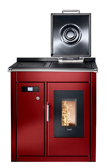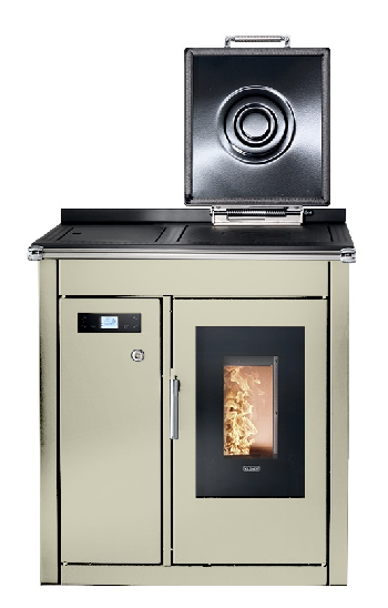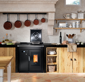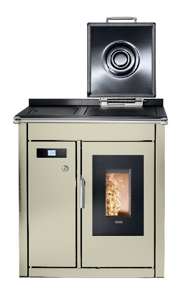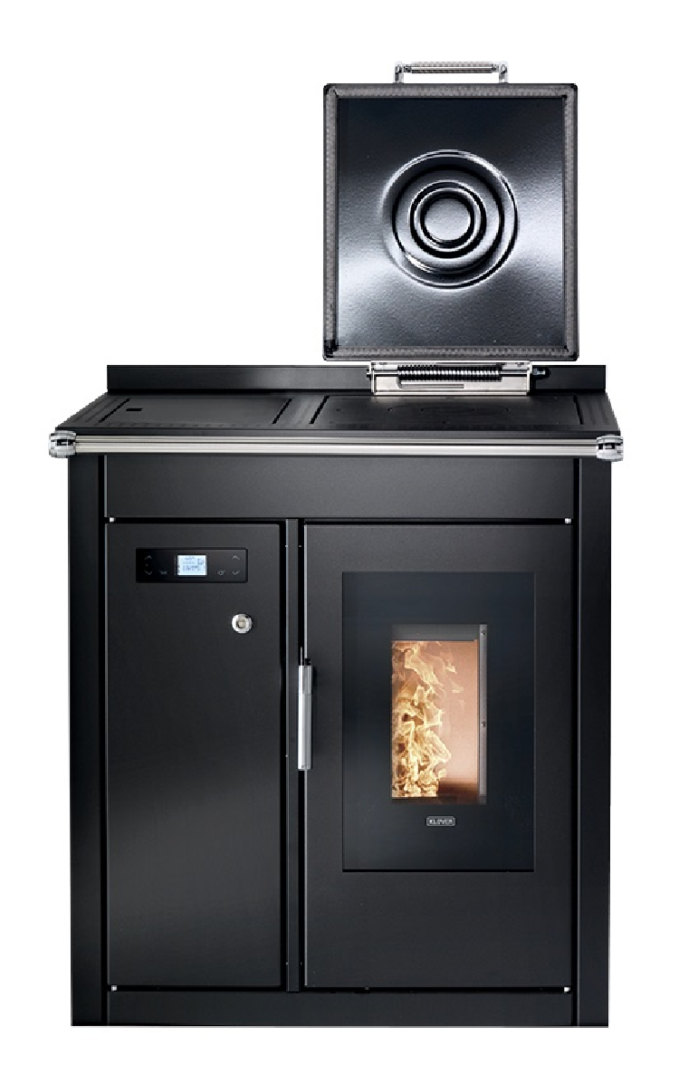 Combining the performance of a modern pellet boiler with the pleasure of cooking on a traditional stove, the Hydro Smart 80 BT stove from Klover, Italy, fits easily into any kitchen. Its compact shape and small footprint allow it to fit into our small interiors. Available in a choice of three colors (Matte Black, Cream White, Red), it will sometimes take on a retro look, and sometimes a resolutely modern look.