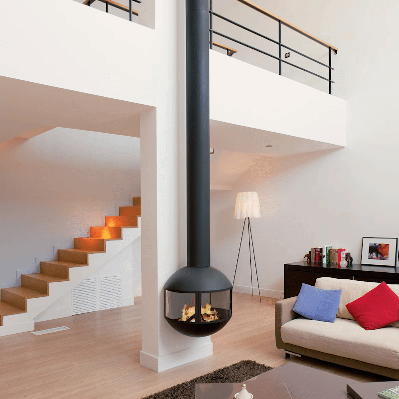 Standing, with or without a visible flue pipe, this wood fireplace allows many arrangements. Protected in its glass globe, the fire is discreetly displayed for all to see. Two fixed glass panes and a third, central one, which acts as a door, give the Edofocus a maximum of security and ease of use.