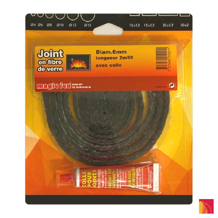 Braided fibreglass round gasket, diameter 6mm, length 250cm, with tube of high temperature glue included.