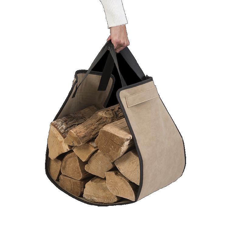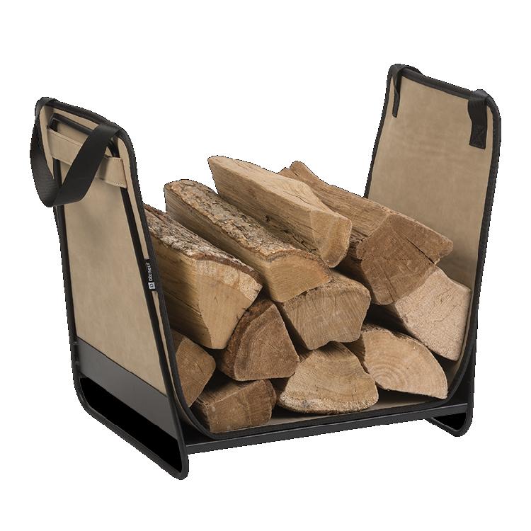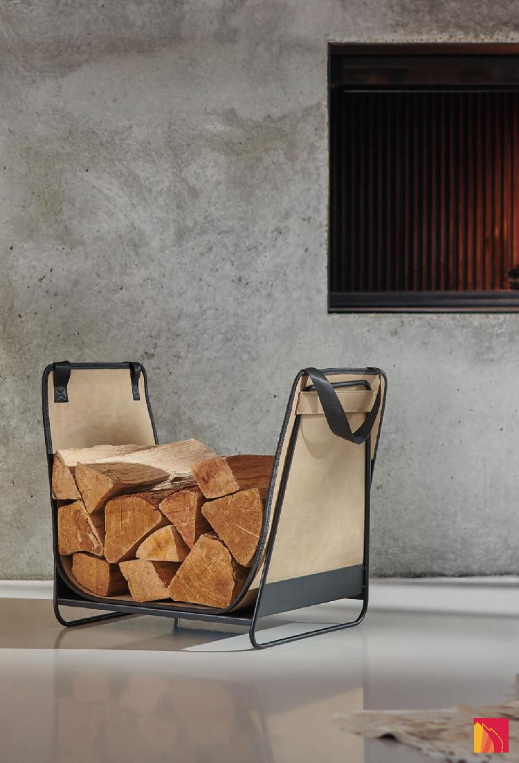 2-in-1 wood rack: Havana features a steel structure for wood storage and a simulated carry bag. This wood storage unit plays on lightness: its transport bag is suspended in the steel structure. Its sandy color evokes Cuban escapism (12 logs approx.).