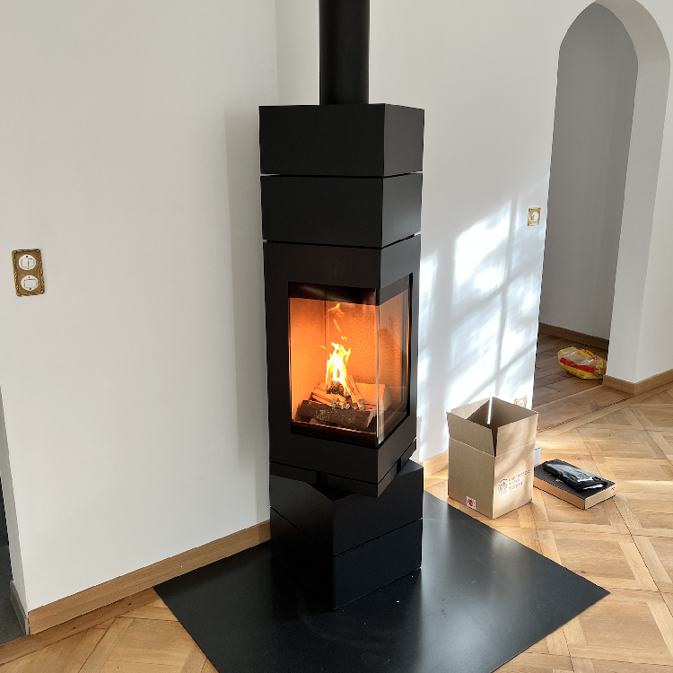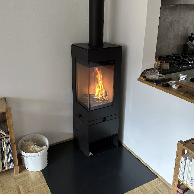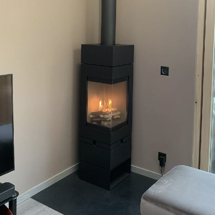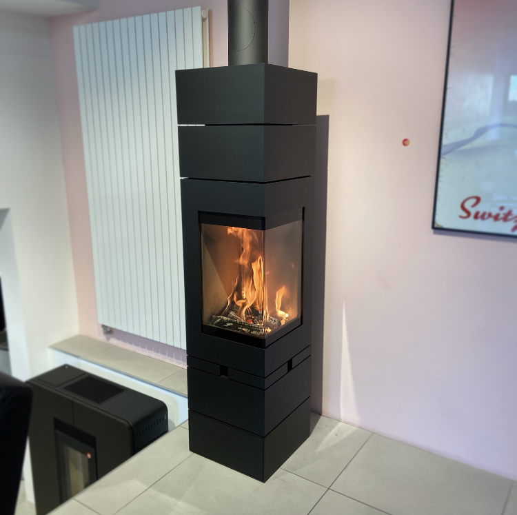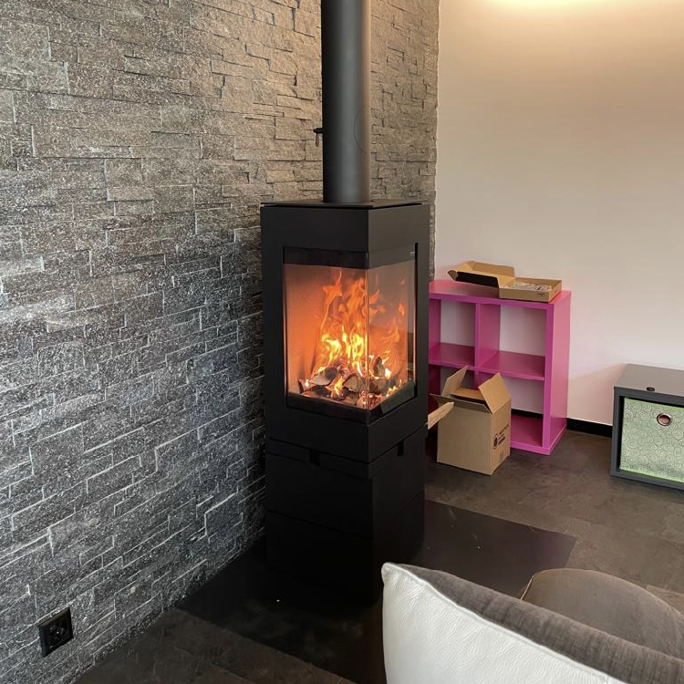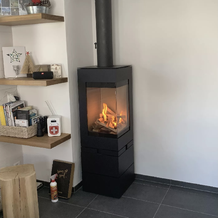 Naast zijn gedurfde architectuur biedt deze A energieklasse houtkachel een rendement van 84%, perfect voor middelgrote volumes. Het is verkrijgbaar in drie afwerkingen: zwart, staal of platina.